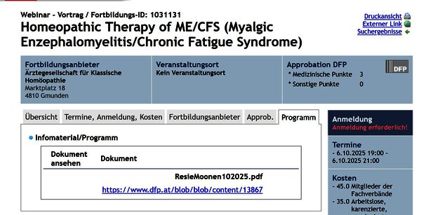 Am 6.10.2025 wurde eine „Diplom“fortbildung „Homeopathic Therapy of ME/CFS (Myalgic Enzephalomyelitis/Chronic Fatigue Syndrome)“ von der Arztakademie mit 3 medizinischen(!) DFP-Punkten beschenkt. Man lasse sich das auf der Zunge zergehen. Es gibt eine Erkrankung, deren effiziente Behandlung für die konventionelle Medizin derzeit unklar ist. Eine Pseudomedizinmethode aus der vorwissenschaftlichen Ära der Medizin, deren Wirkung nicht über Placebowirkung hinausgeht, wird von der Arztakademie offensichtlich als ernstzunehmende Medizin betrachtet. Sie vergibt für diese Fortbildung 3 medizinische Fortbildungspunkte. Vortragende war die niederländische Homöopathin Dr. Reesi Moonen, die u.a. auch Ganzheitliche Sterbebegleitung mit Homöopathie anbietet. Der im dfpkalender angegebene Link zum Programm funktioniert ausserdem nicht.