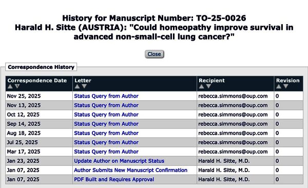 Weiterhin unbeantwortet vom „The Oncologist“ ist die Situation des Commentarys zum Editorial und den Corrections, um den das Journal Harald Sitte ersucht hatte. Es wurde im Jänner 2025 eingeschickt und von Reviewern im Juni fertig begutachtet, bis heute (25.11.2025) gibt es keine Entscheidung über eine Publikation, das Ergebnis der Reviewer wurde nicht kommuniziert, auf Anfragen wird nicht geantwortet.