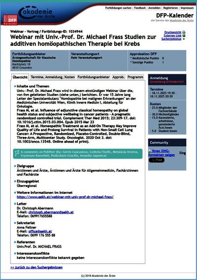 Im dpfkalender.at der Arztakademie war ein Webinar mit 1 DFP-Punkt von Michael Frass angekündigt, in dem er über seine Studie und den Erfolg von Homöopathie bei fortgeschrittenem Lungenkrebs berichten würde. Die Ankündigung der Veranstaltung ist noch immer online. Wie so häufig bei derartigen Veranstaltungen, gab es auf der Website keine Information über das Programm der Veranstaltung, lediglich die Studie wurde zitiert.